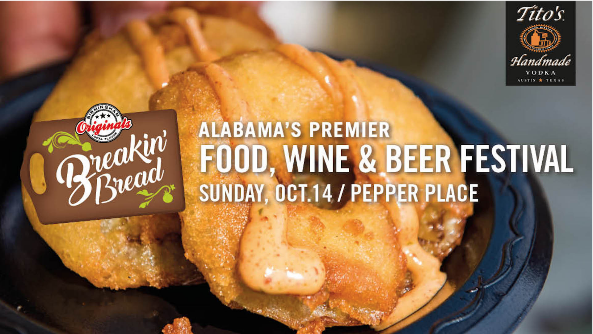 Join the Birmingham Originals at Pepper Place Sunday, Oct. 14 for the 16th annual Breakin’ Bread presented by Tito’s Handmade Vodka! Enjoy a day filled with unlimited food sampling along with craft beer and wine, a makers’ market comprised of craftsmen from Pepper Place Market, a kid’s zone with special activities for children, live musical entertainment from Todd Coder Duo, Taylor Hunnicut and Alvin Garrett and more! Proceeds from the event will benefit Jones Valley Teaching Farm’s (JVTF) Urban Farm Project.